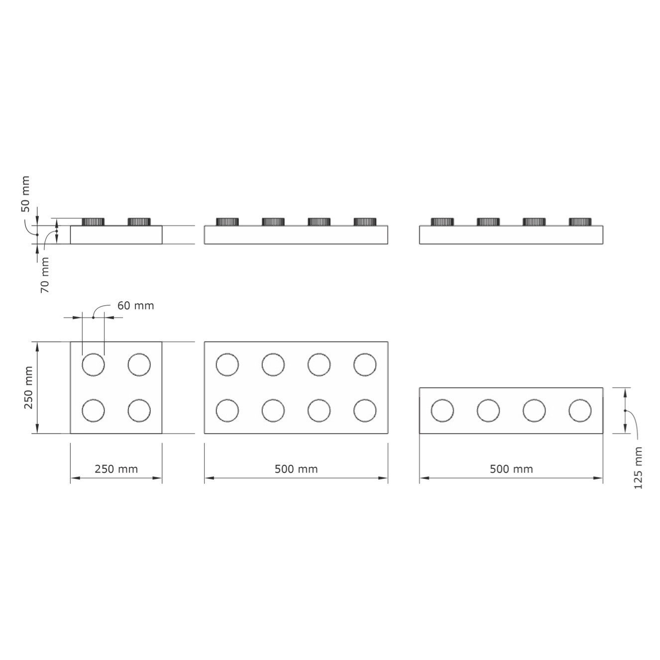 25 × 25 cm, 50 × 12,5 cm, 50 × 25 cm