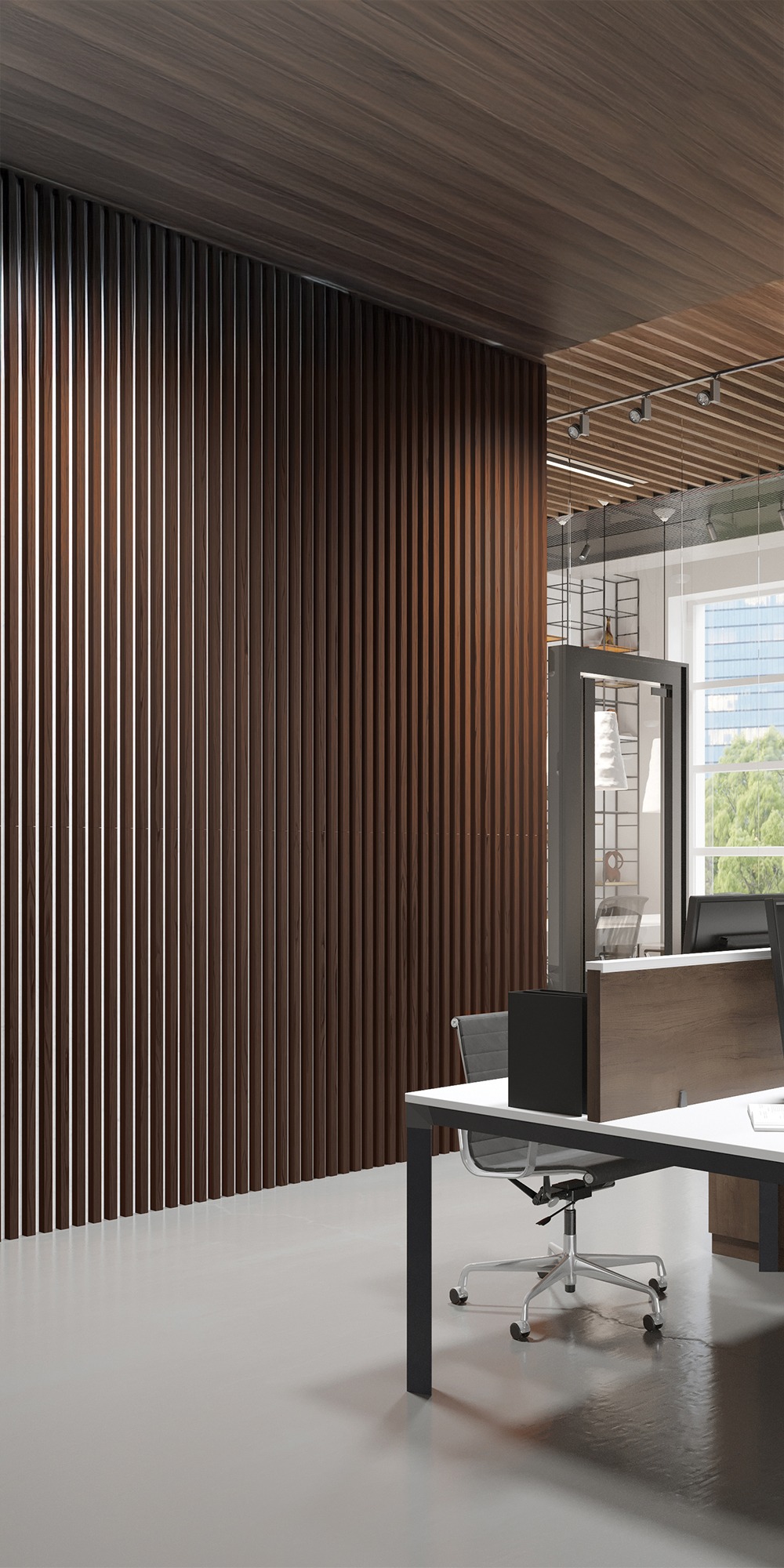 Les panneaux muraux sont faits de placage de chêne naturel et de feutre recyclé. Ils améliorent l’acoustique de la pièce. Ce sont également des éléments décoratifs qui apportent une touche esthétique à tout intérieur. Ils peuvent être fixés au mur ou au plafond. Leur structure est composée de lamelles verticales en chêne fixées à un feutre de 12 mm.