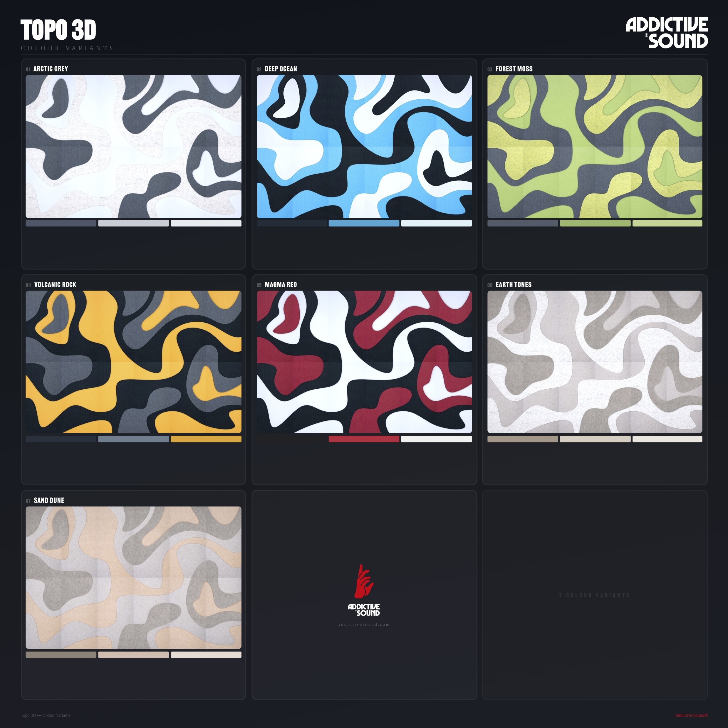 Pro.Felt Topo 3D est un panneau acoustique décoratif composé de trois couches de feutre certifié Pro.Felt 9mm, découpées en formes organiques inspirées des lignes topographiques. Les couches superposées créent un véritable effet 3D d'une épaisseur maximale de 27mm. Un seul panneau de 100 x 50 cm réduit efficacement la réverbération et l'écho, et grâce au système d'assemblage des panneaux, il est possible de créer une composition harmonieuse allant jusqu'à 300 x 200 cm (grille 6 x 2). Le panneau dispose de bandes adhésives appliquées en usine pour le montage sur des surfaces murales lisses et planes. Sept variantes de couleurs et douze motifs (A1–A6, B1–B6) permettent d'adapter l'installation à tout intérieur.