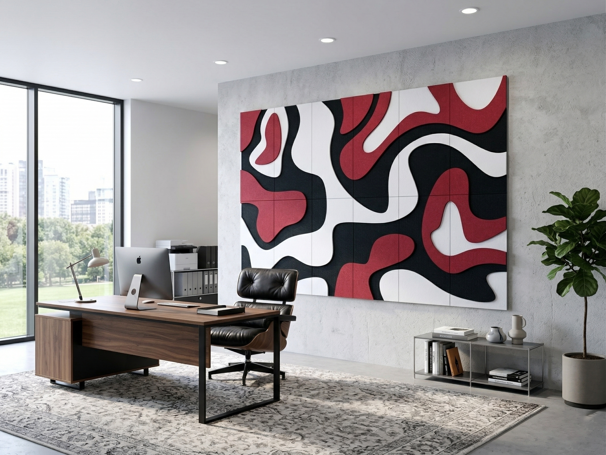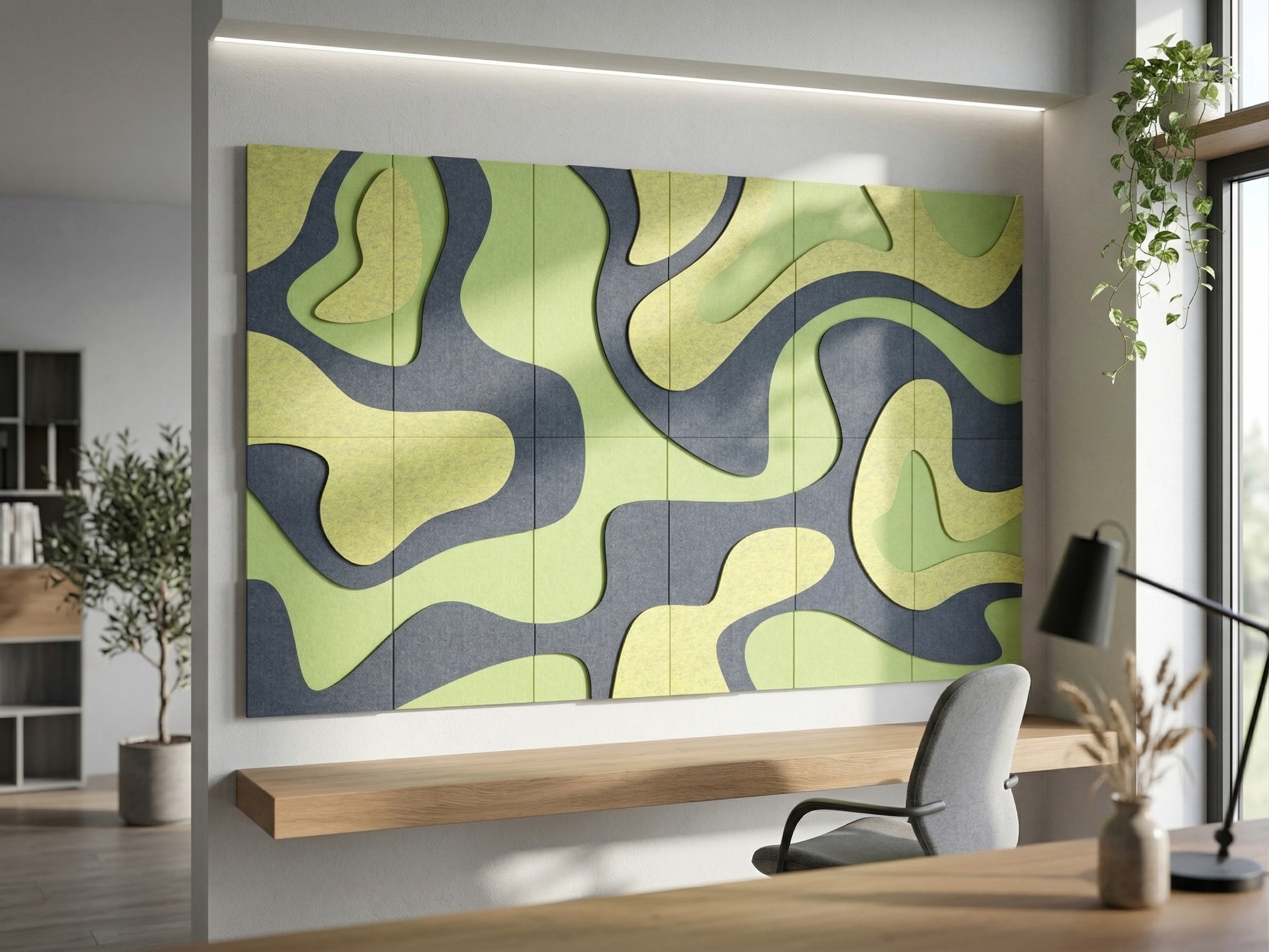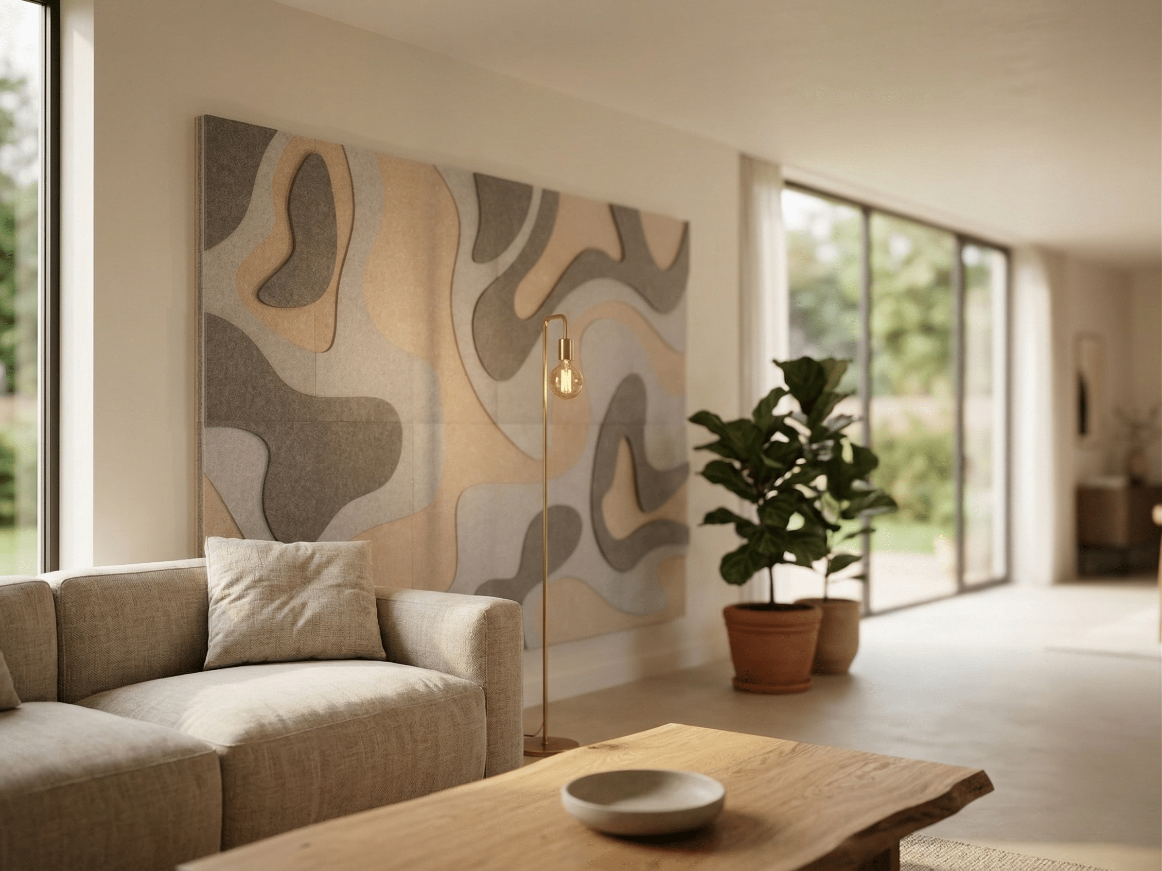 Une structure tridimensionnelle unique en feutre acoustique crée un jeu saisissant de lumière et d’ombre sur le mur. Les éléments géométriques ajoutent profondeur et caractère à l’intérieur, alliant fonction décorative et acoustique.