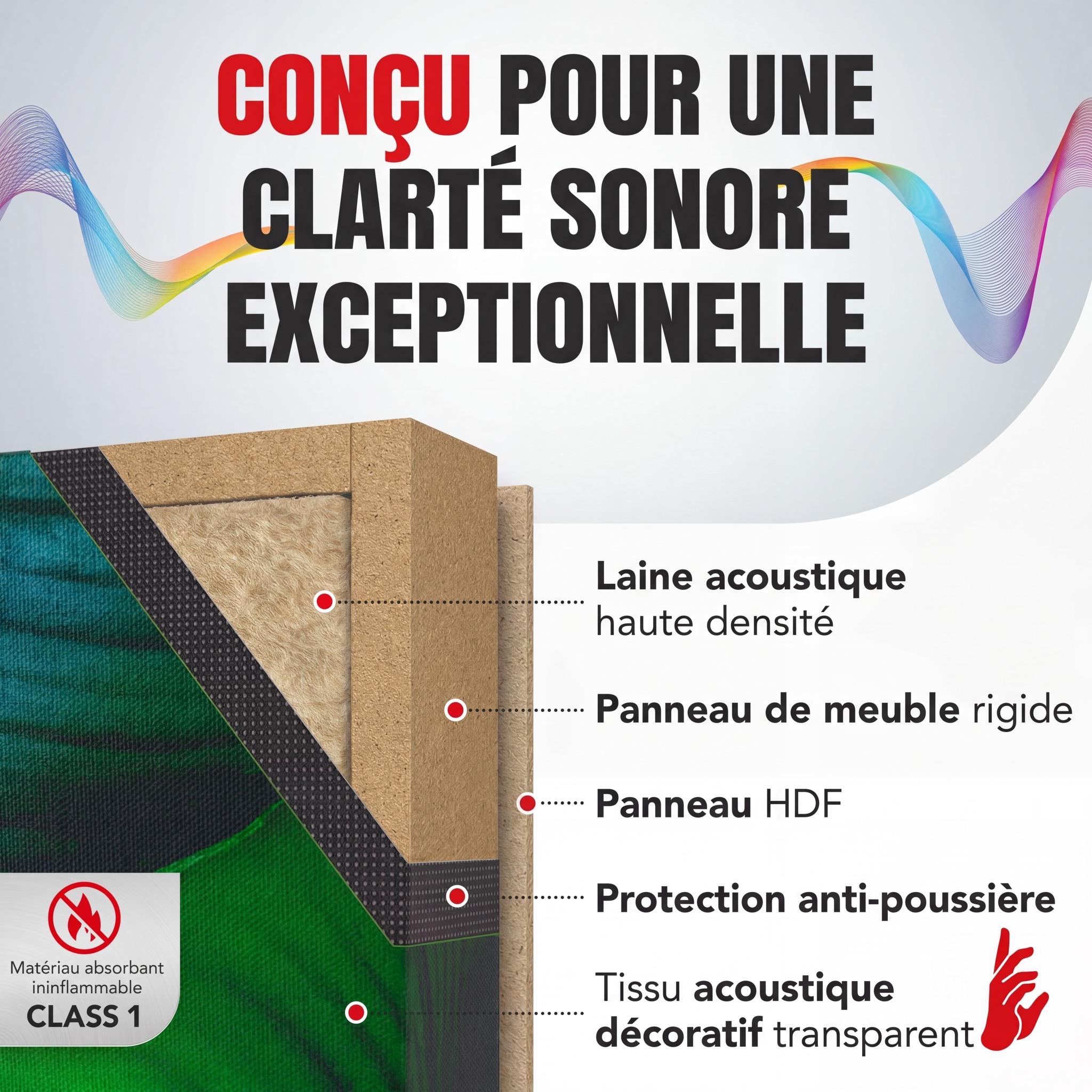 Tableau Acoustique est un panneau acoustique unique qui combine un contrôle sonore efficace avec une haute esthétique intérieure. Il élimine efficacement la réverbération, l"écho et les sons indésirables, assurant un son clair et net. Le remplissage en laine minérale Isover PT80 de haute qualité garantit une excellente absorption de toutes les fréquences, y compris les tons graves. La construction solide en panneau de meuble avec finition HDF améliore en outre l"absorption des basses. De plus, il remplit une fonction décorative - grâce à l"impression de graphiques sélectionnés sur un tissu acoustiquement transparent, il s"intègre harmonieusement dans le caractère de chaque pièce.