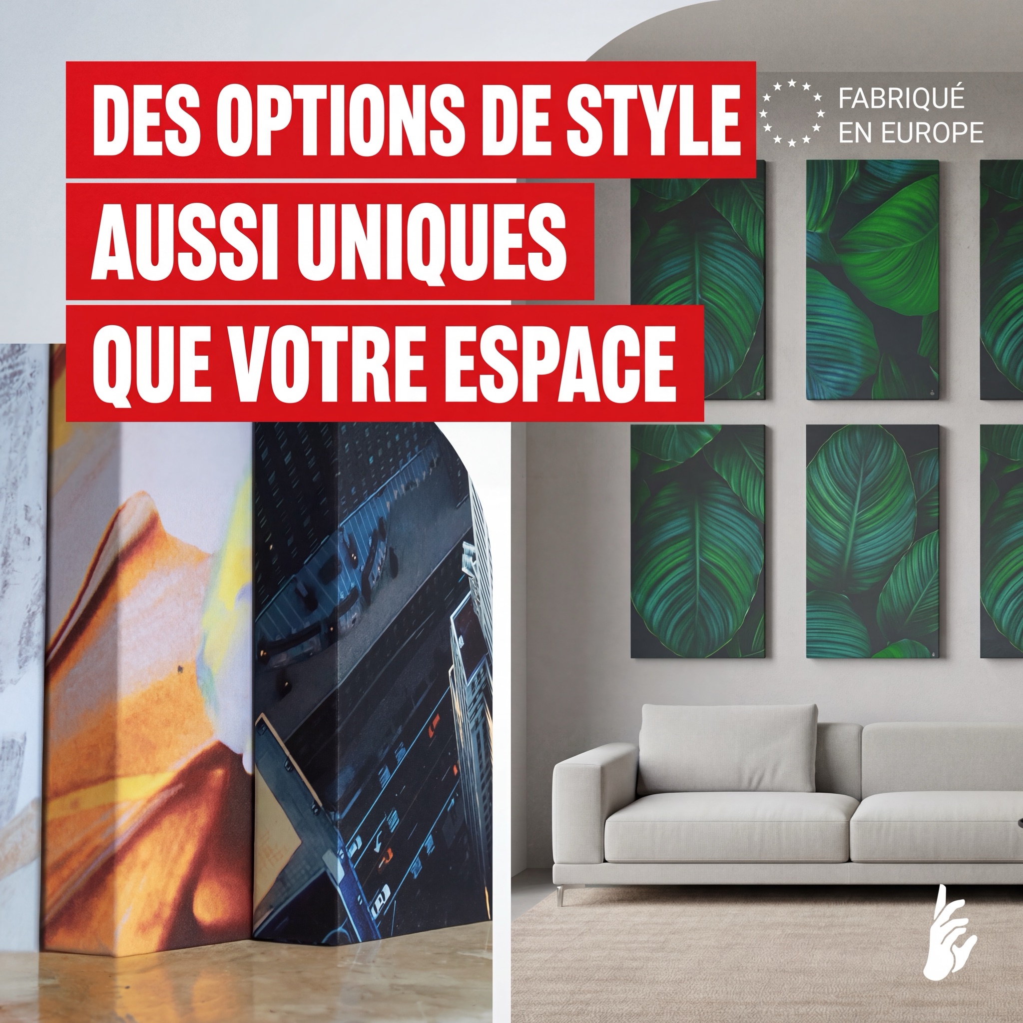 Choisissez parmi 45 motifs uniques, d’abstraits à naturels. Chaque visuel est appliqué par une technologie d’impression dédiée sur tissu acoustique – un art mural fonctionnel.