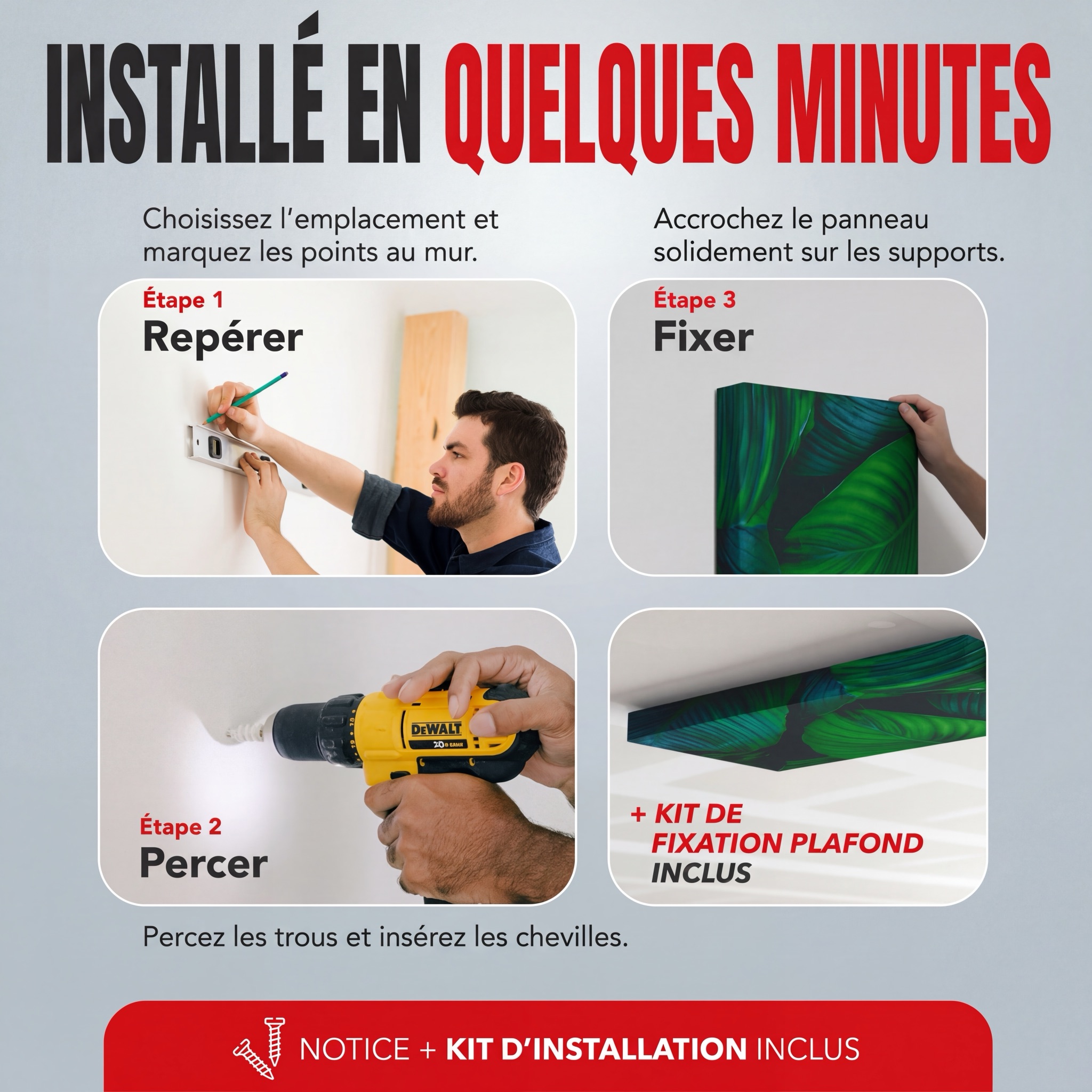 Vous recevez un kit de montage complet permettant d’installer le panneau exactement où vous le souhaitez : au mur ou au plafond (à sélectionner lors de la commande).